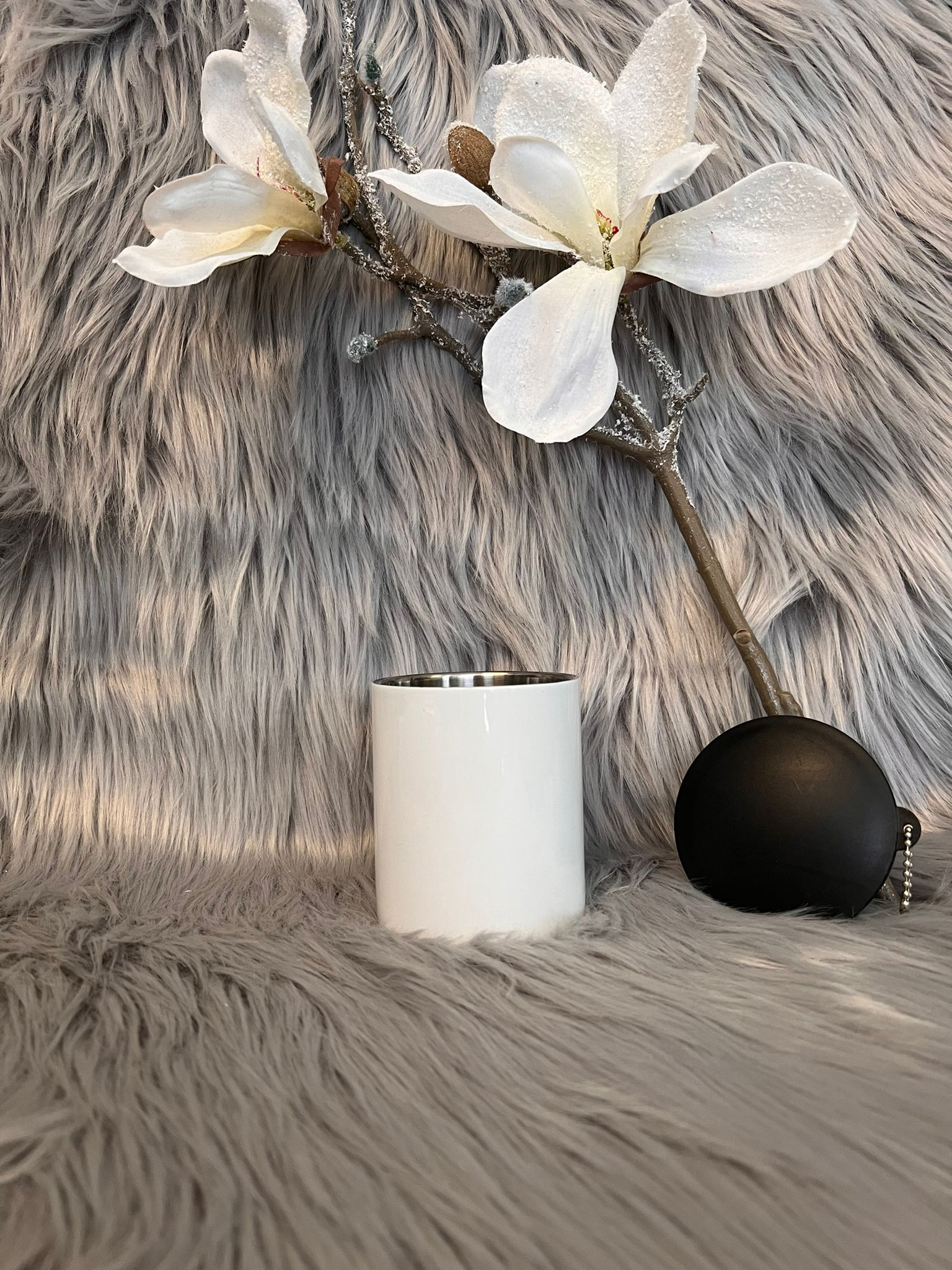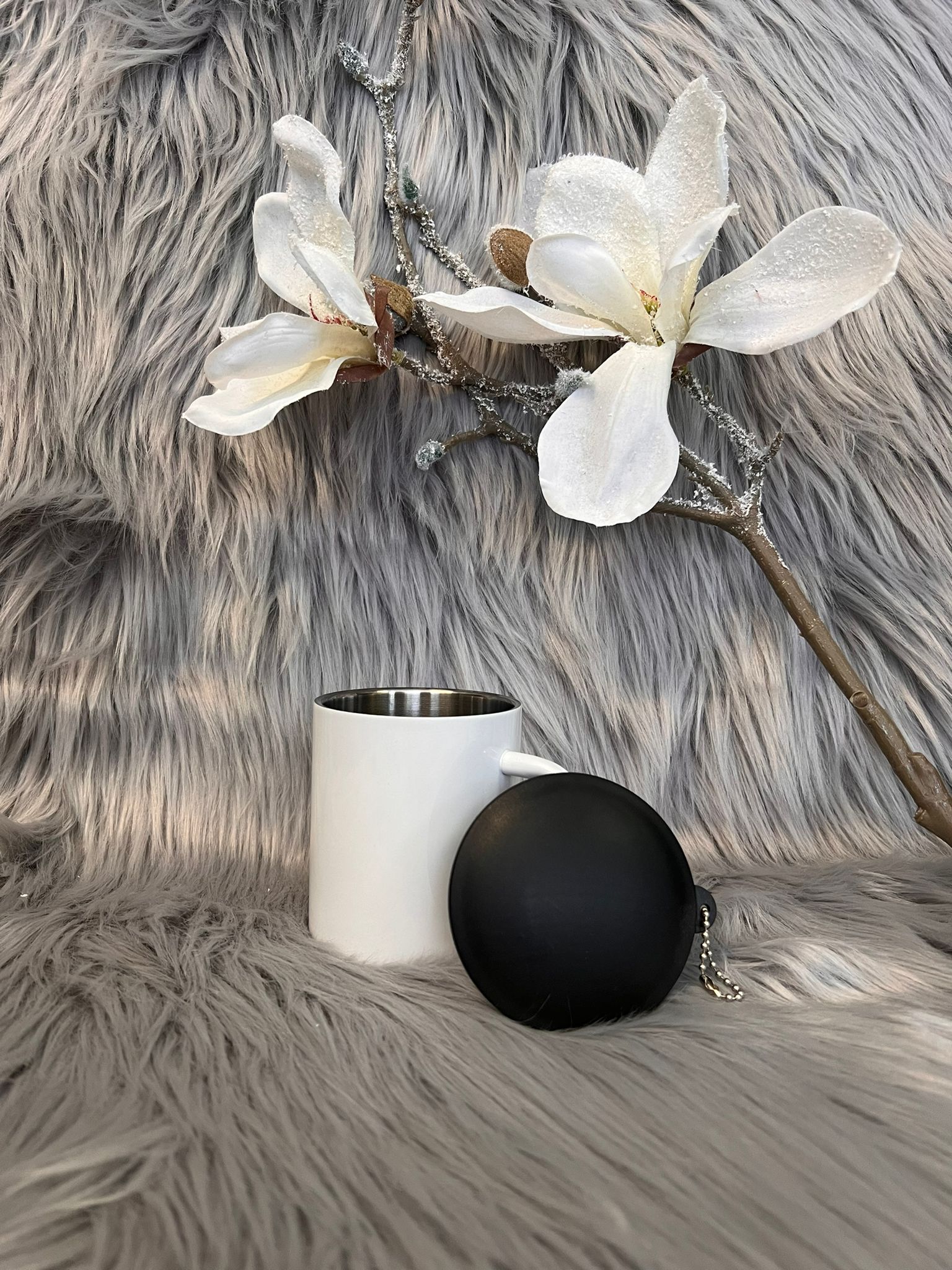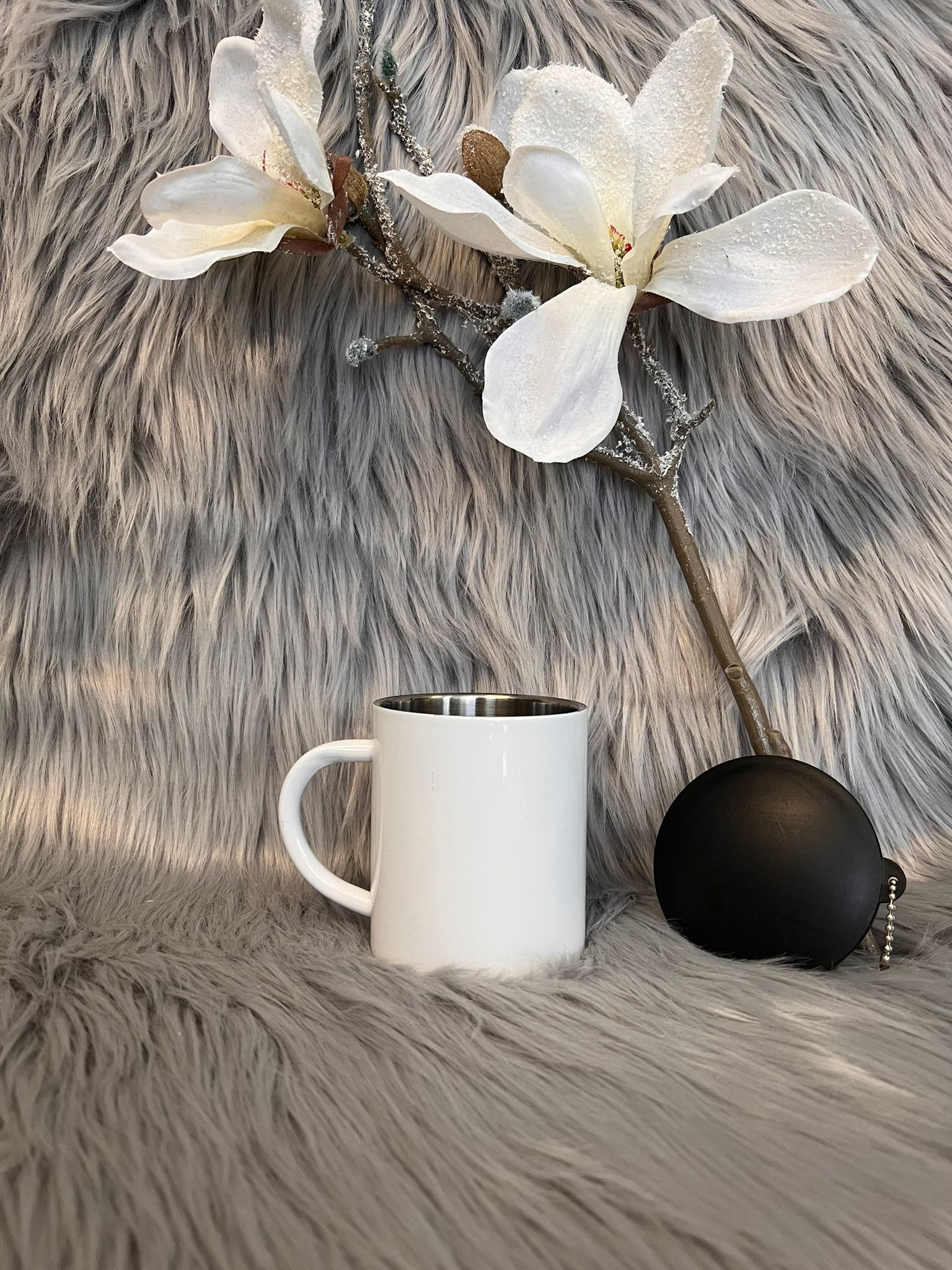 Leichte, bruchfeste Edelstahltasse mit weißer Aussenseite und dazugehörigem Deckel. Es wird die Handspülung empfohlen.