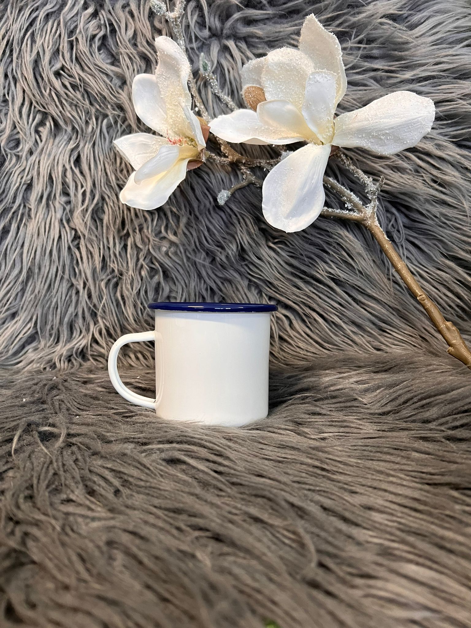 Emaille-Tasse weiß, mit blauem Rand, 10 oz (ca. 300ml), inkl. Druck